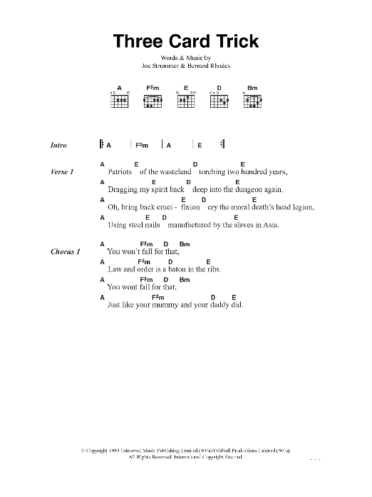 Download or print The Clash Three Card Trick sheet music, chords and digital score arranged for Guitar Chords/Lyrics. This Rock score includes 3 page(s).