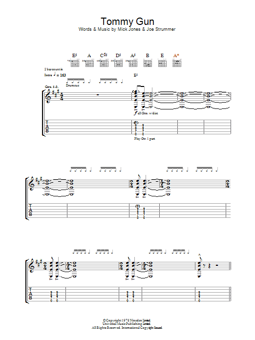 Download or print The Clash Tommy Gun sheet music, chords and digital score arranged for Guitar Tab. This Punk score includes 7 page(s).