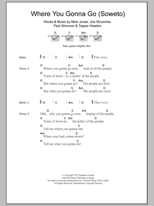 Download or print The Clash Where You Gonna Go (Soweto) sheet music, chords and digital score arranged for Guitar Chords/Lyrics. This Rock score includes 2 page(s).