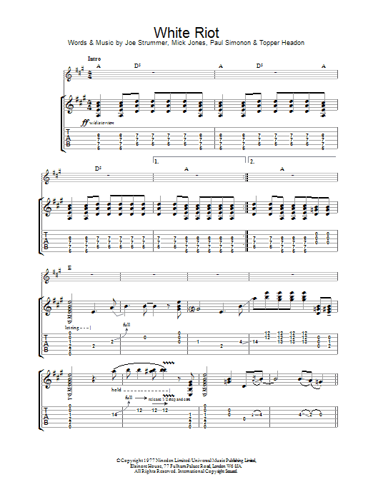 Download or print The Clash White Riot sheet music, chords and digital score arranged for Guitar Tab. This Pop score includes 5 page(s).