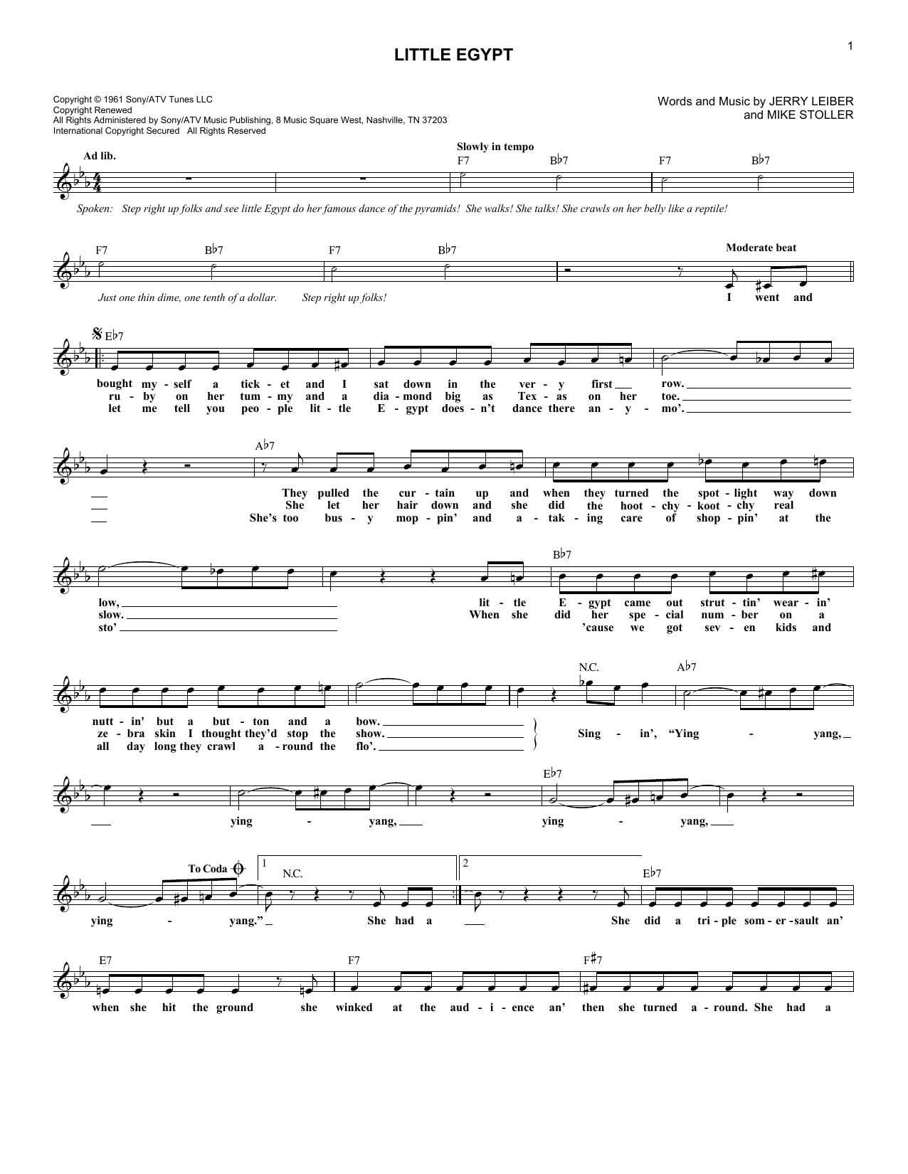 Download or print The Coasters Little Egypt sheet music, chords and digital score arranged for Lead Sheet / Fake Book. This Rock score includes 2 page(s).