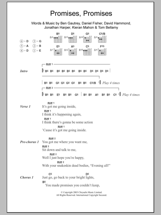Download or print The Cooper Temple Clause Promises Promises sheet music, chords and digital score arranged for Guitar Chords/Lyrics. This Rock score includes 2 page(s).