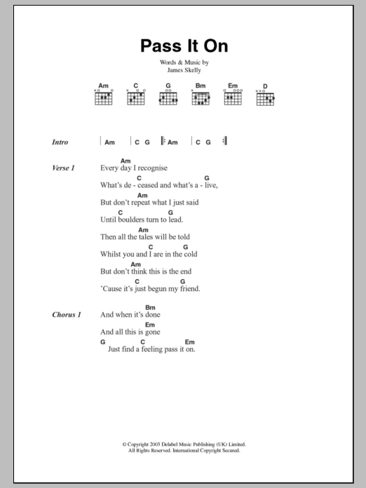 Download or print The Coral Pass It On sheet music, chords and digital score arranged for Guitar Chords/Lyrics. This Rock score includes 2 page(s).