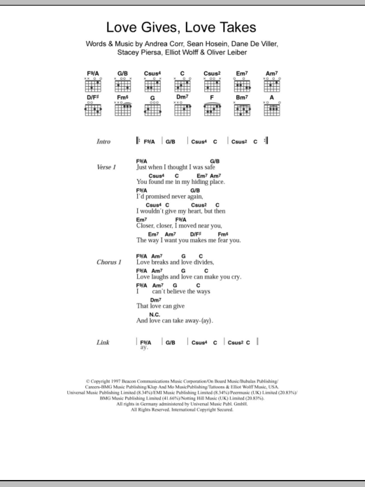 Download or print The Corrs Love Gives Love Takes sheet music, chords and digital score arranged for Guitar Chords/Lyrics. This Pop score includes 2 page(s).
