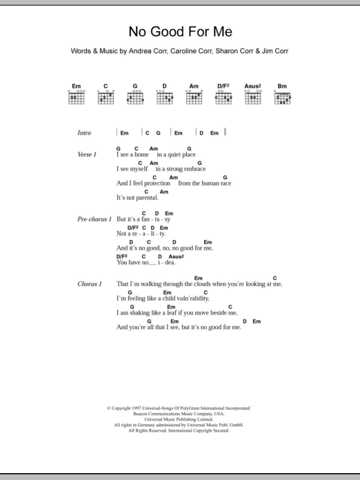 Download or print The Corrs No Good For Me sheet music, chords and digital score arranged for Guitar Chords/Lyrics. This Pop score includes 3 page(s).