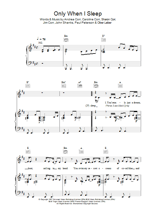 Download or print The Corrs Only When I Sleep sheet music, chords and digital score arranged for Guitar Chords/Lyrics. This Pop score includes 4 page(s).