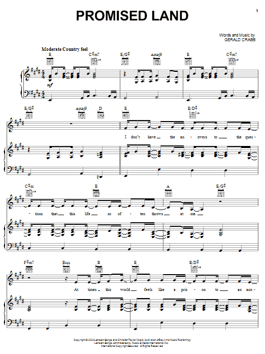 Download or print The Crabb Family Promised Land sheet music, chords and digital score arranged for Piano, Vocal & Guitar Chords (Right-Hand Melody). This Christian score includes 7 page(s).