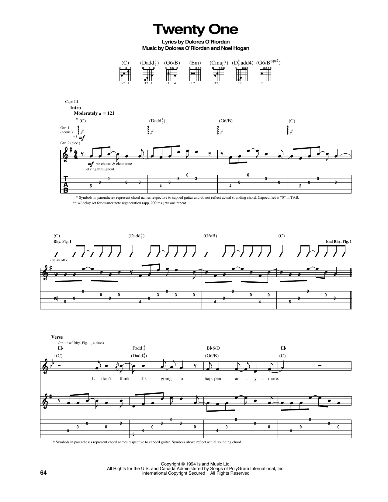 Download or print The Cranberries Twenty One sheet music, chords and digital score arranged for Guitar Tab. This Pop score includes 6 page(s).