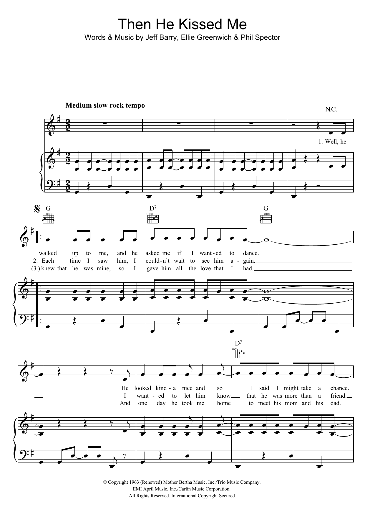 Download or print The Crystals (And) Then He Kissed Me sheet music, chords and digital score arranged for Piano, Vocal & Guitar Chords (Right-Hand Melody). This Pop score includes 3 page(s).