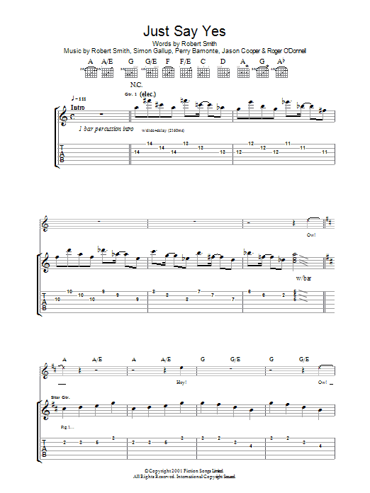 Download or print The Cure Just Say Yes sheet music, chords and digital score arranged for Guitar Tab. This Pop score includes 8 page(s).