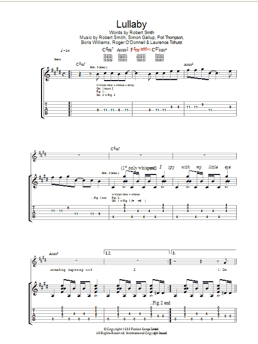 Download or print The Cure Lullaby sheet music, chords and digital score arranged for Guitar Tab. This Pop score includes 6 page(s).