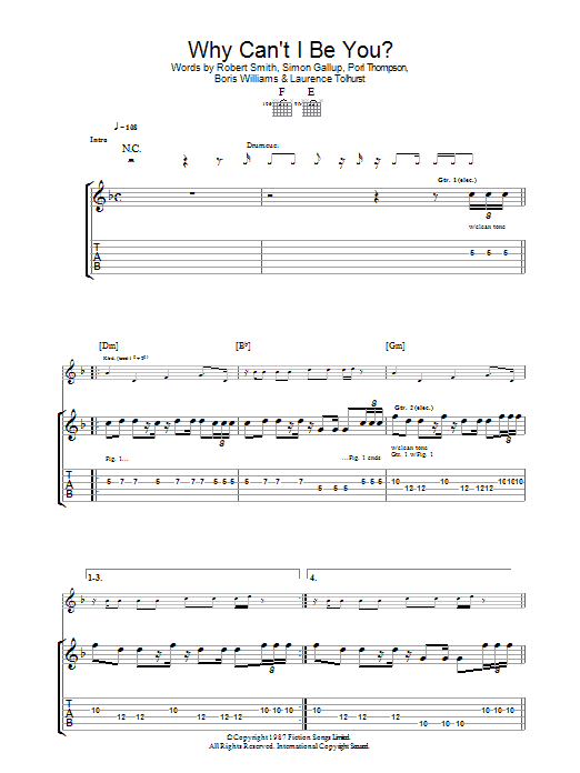 Download or print The Cure Why Can't I Be You? sheet music, chords and digital score arranged for Guitar Tab. This Pop score includes 5 page(s).