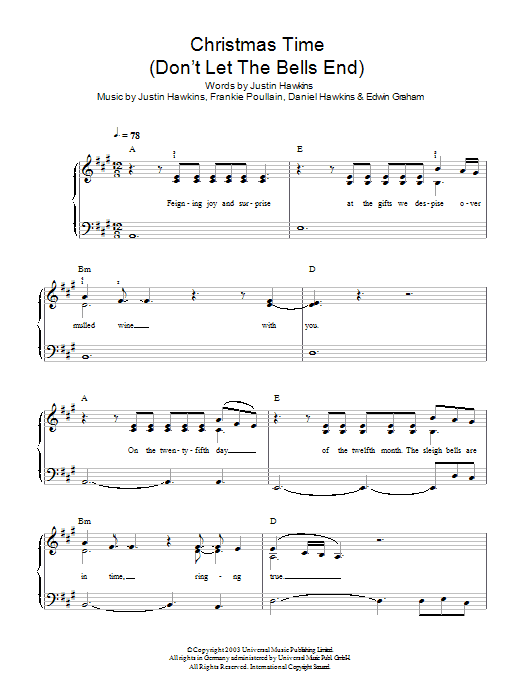 Download or print The Darkness Christmas Time (Don't Let The Bells End) sheet music, chords and digital score arranged for Guitar Chords/Lyrics. This Rock score includes 3 page(s).
