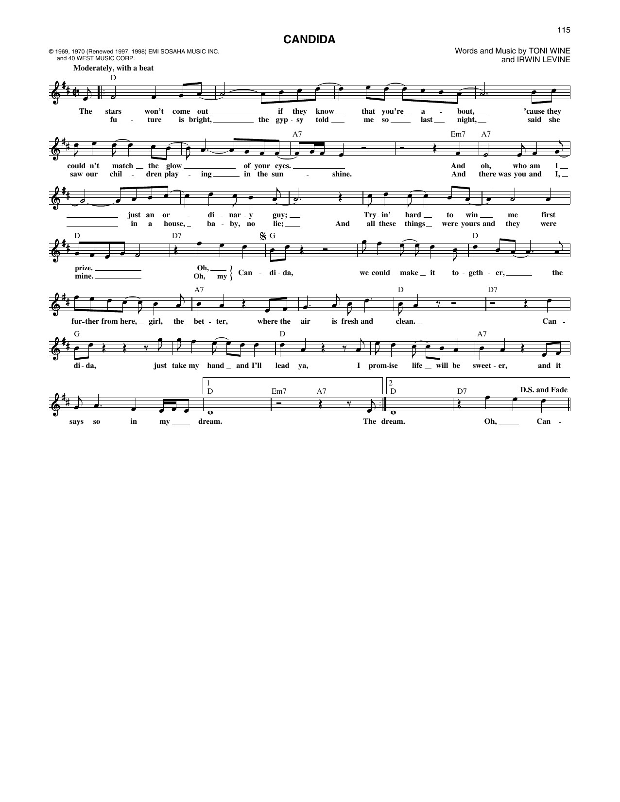 Download or print The Dawn & Tony Orlando Candida sheet music, chords and digital score arranged for Piano, Vocal & Guitar Chords (Right-Hand Melody). This Pop score includes 3 page(s).