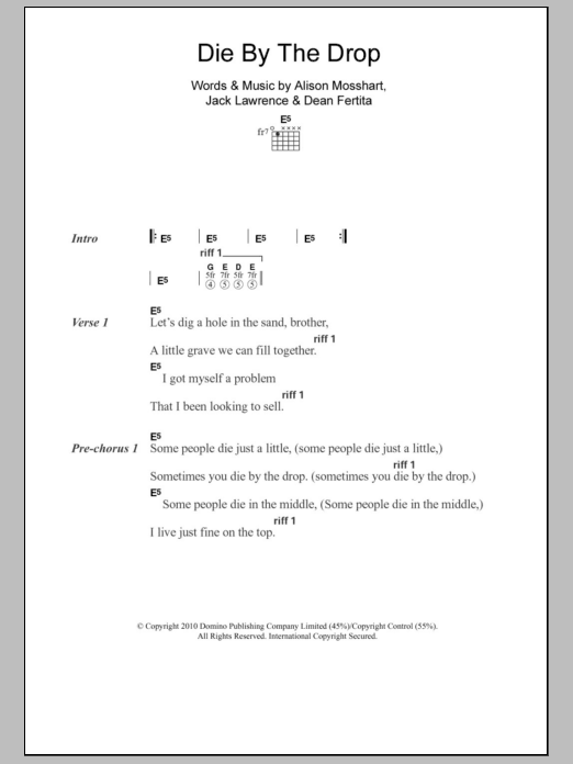 Download or print The Dead Weather Die By The Drop sheet music, chords and digital score arranged for Guitar Chords/Lyrics. This Rock score includes 3 page(s).