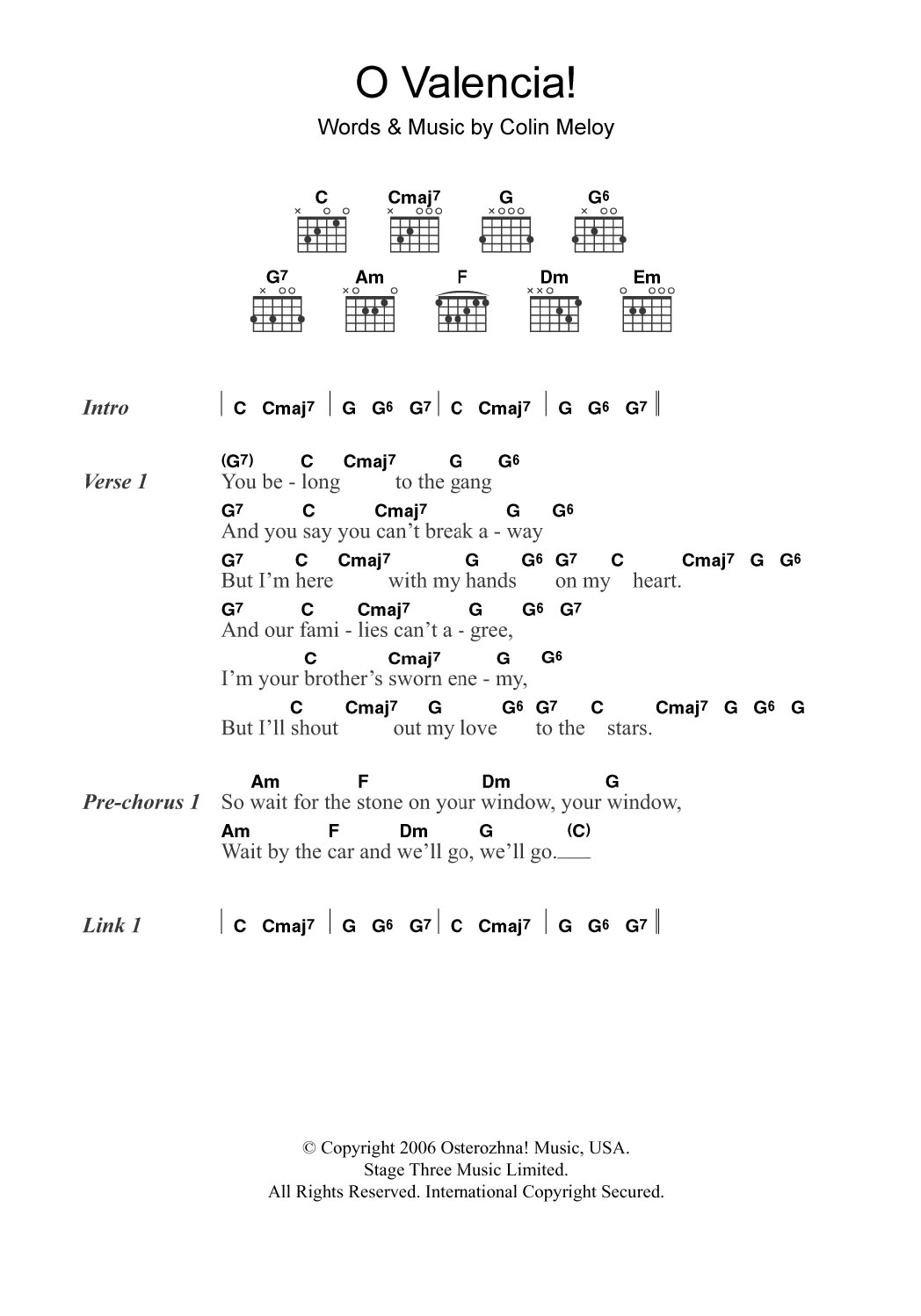 Download or print The Decemberists O Valencia! sheet music, chords and digital score arranged for Guitar Chords/Lyrics. This Pop score includes 3 page(s).