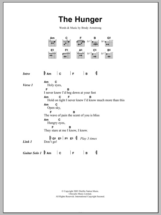 Download or print The Distillers The Hunger sheet music, chords and digital score arranged for Guitar Chords/Lyrics. This Rock score includes 3 page(s).