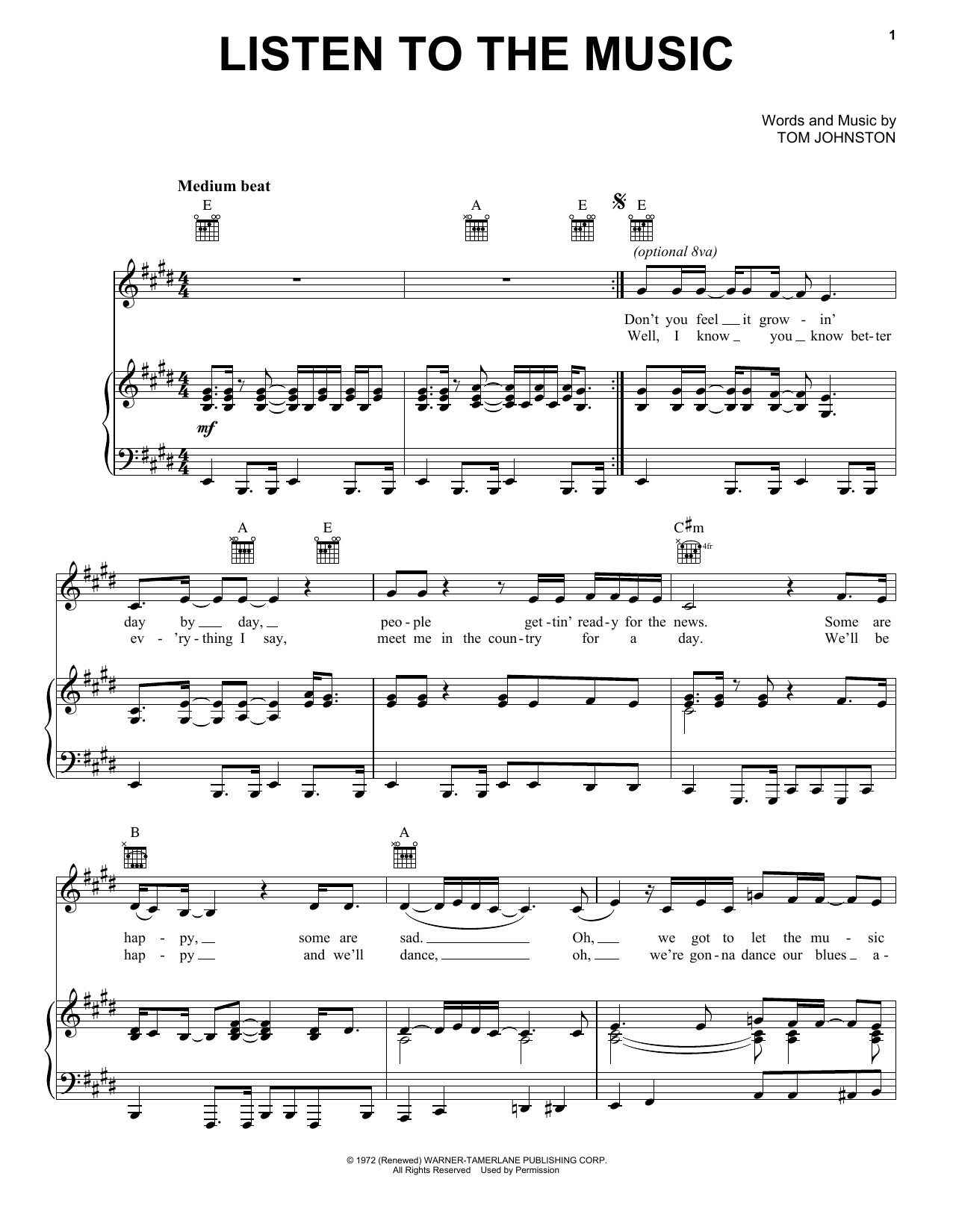 Download or print The Doobie Brothers Listen To The Music sheet music, chords and digital score arranged for Piano & Vocal. This Folk score includes 9 page(s).