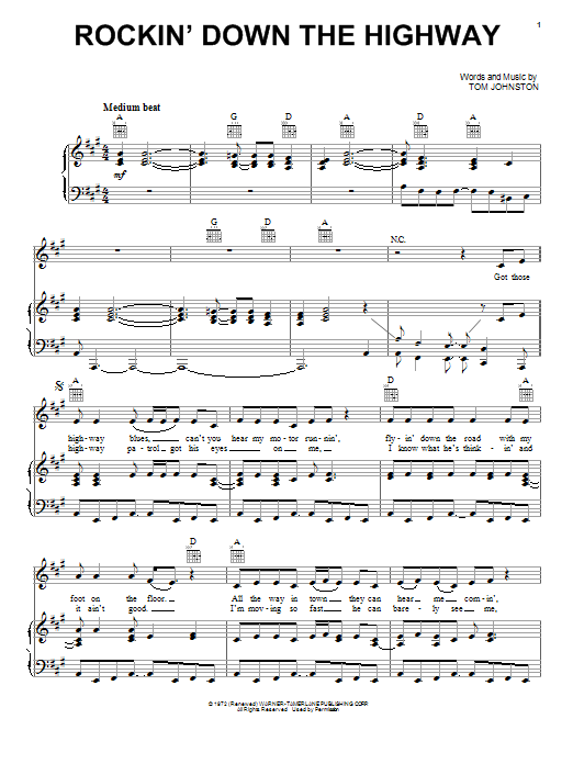 Download or print The Doobie Brothers Rockin' Down The Highway sheet music, chords and digital score arranged for Guitar Tab. This Pop score includes 8 page(s).