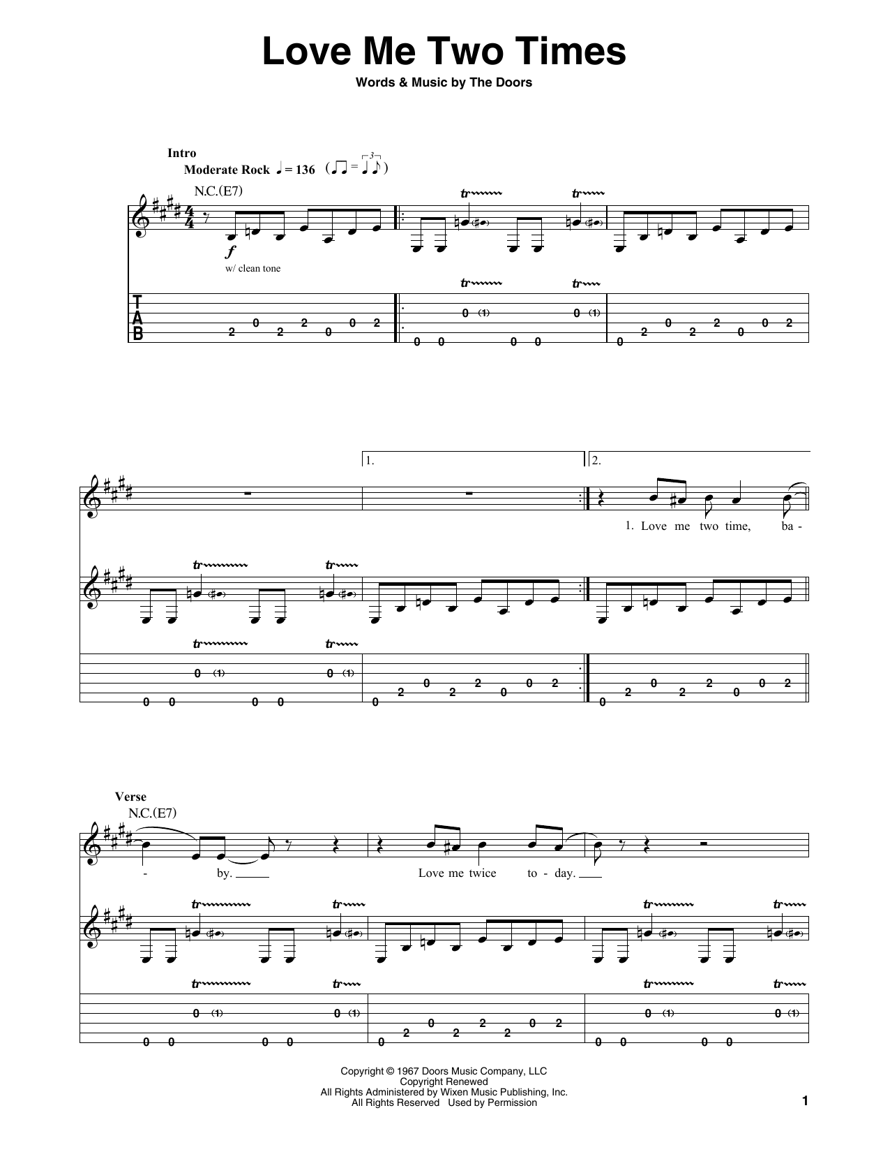 Download or print The Doors Love Me Two Times sheet music, chords and digital score arranged for Piano & Vocal. This Pop score includes 7 page(s).