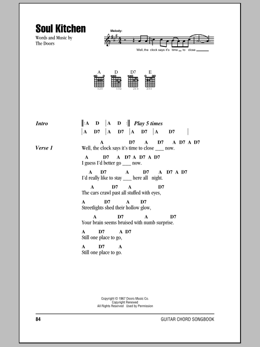 Download or print The Doors Soul Kitchen sheet music, chords and digital score arranged for Piano, Vocal & Guitar Chords (Right-Hand Melody). This Rock score includes 6 page(s).