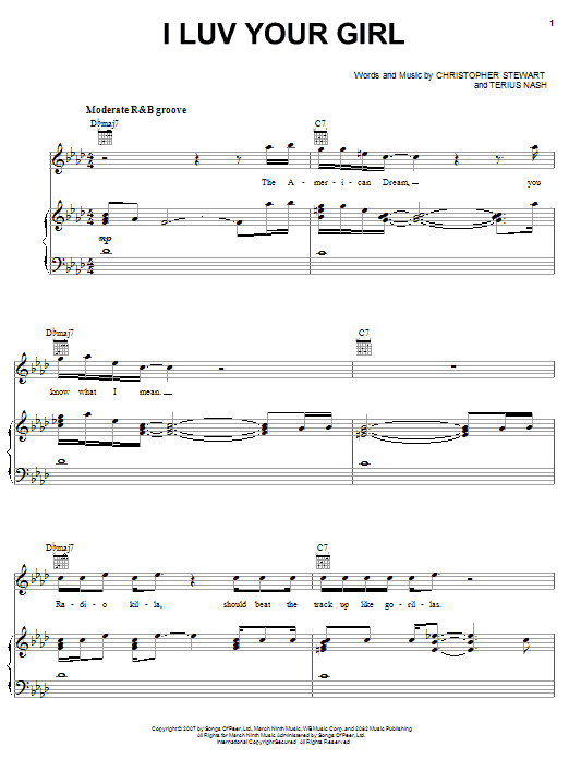 Download or print The Dream I Luv Your Girl sheet music, chords and digital score arranged for Piano, Vocal & Guitar Chords (Right-Hand Melody). This Hip-Hop score includes 10 page(s).