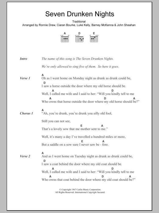 Download or print The Dubliners Seven Drunken Nights sheet music, chords and digital score arranged for Guitar Chords/Lyrics. This Folk score includes 3 page(s).