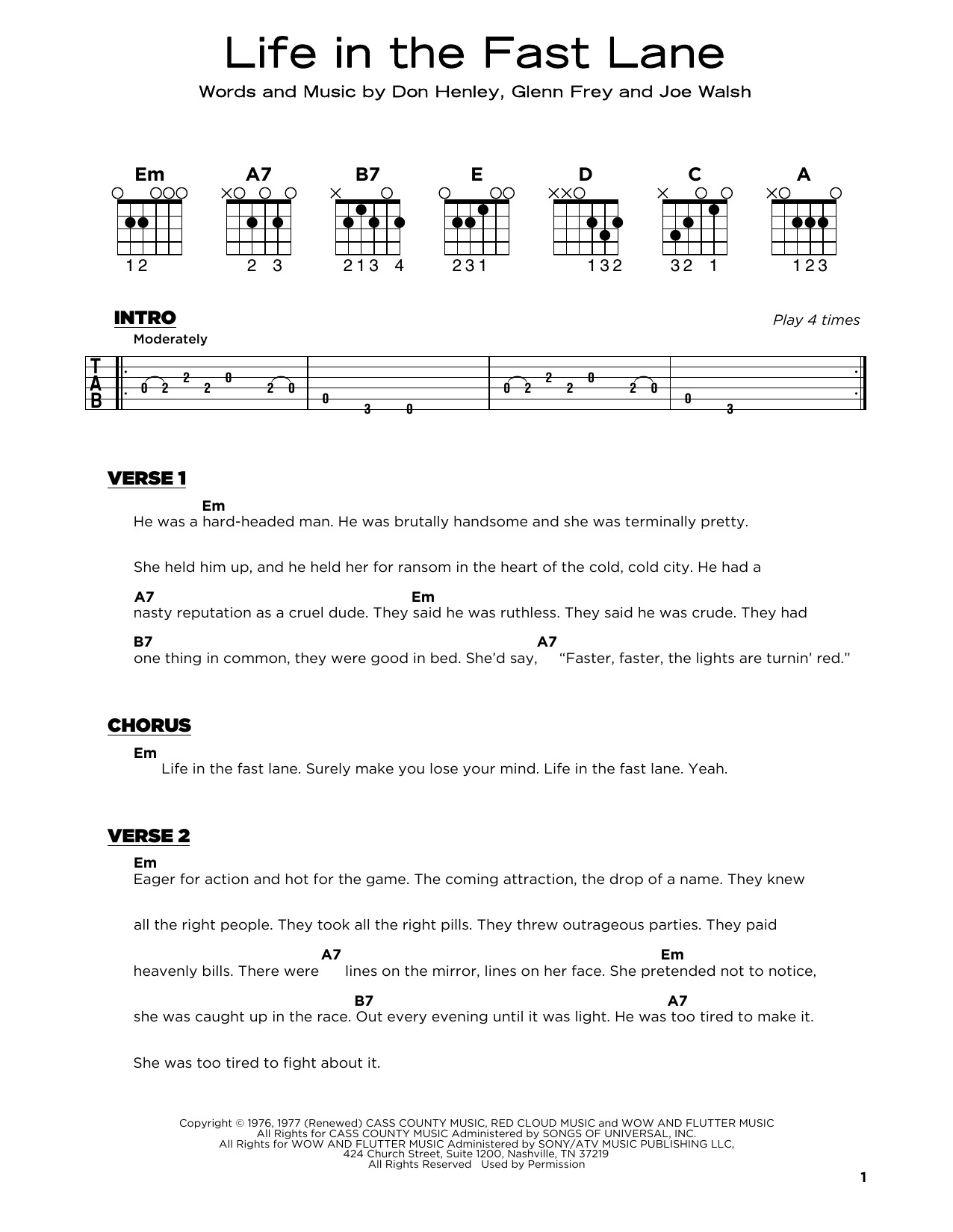 Download or print The Eagles Life In The Fast Lane sheet music, chords and digital score arranged for Really Easy Guitar. This Country score includes 2 page(s).
