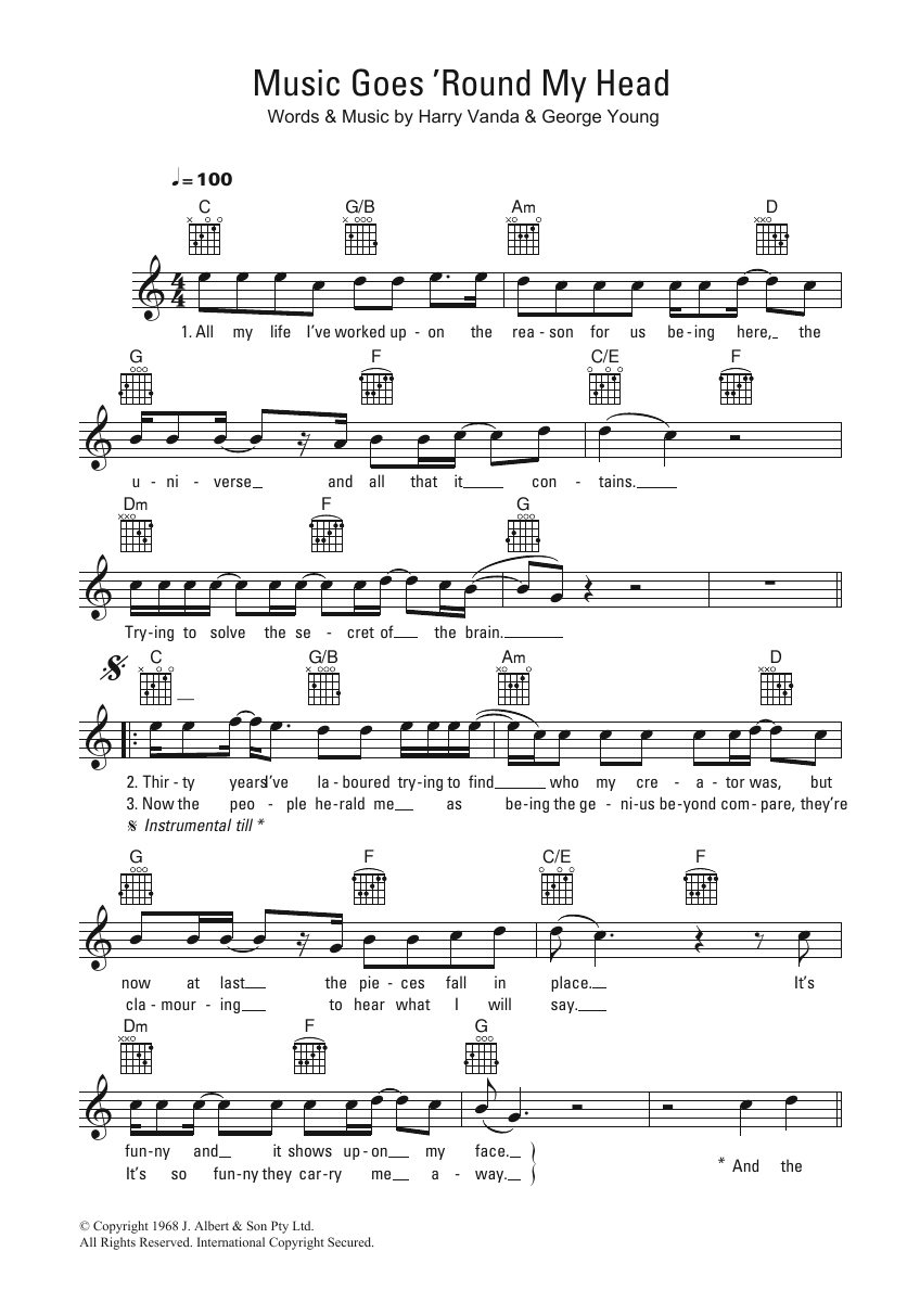Download or print The Easybeats Music Goes 'Round My Head sheet music, chords and digital score arranged for Lead Sheet / Fake Book. This Pop score includes 2 page(s).