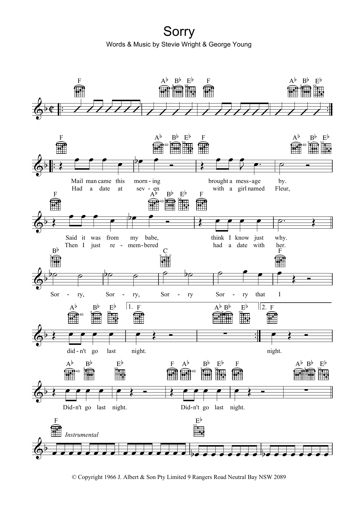 Download or print The Easybeats Sorry sheet music, chords and digital score arranged for Lead Sheet / Fake Book. This Pop score includes 2 page(s).