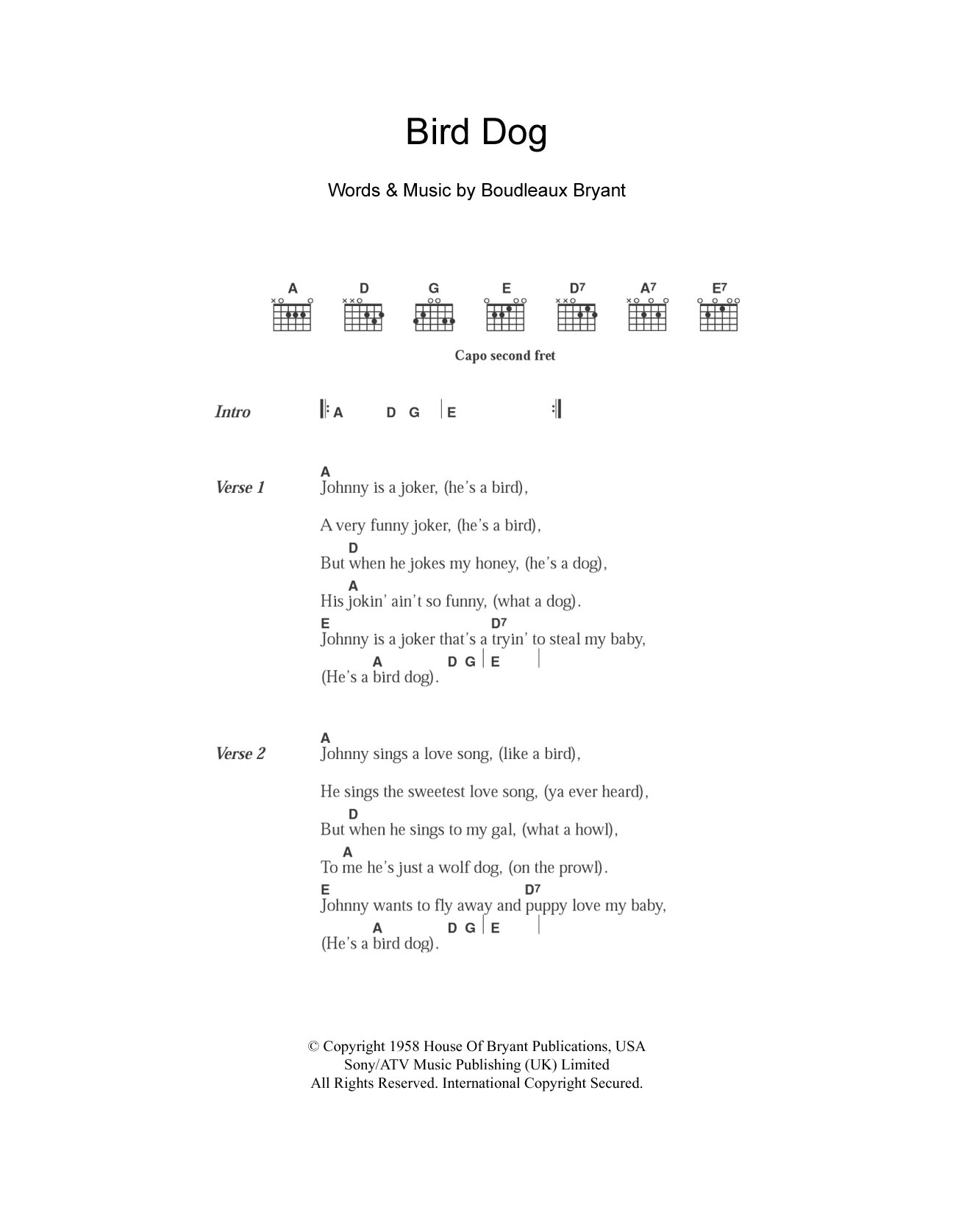 Download or print The Everly Brothers Bird Dog sheet music, chords and digital score arranged for Guitar Chords/Lyrics. This Pop score includes 2 page(s).