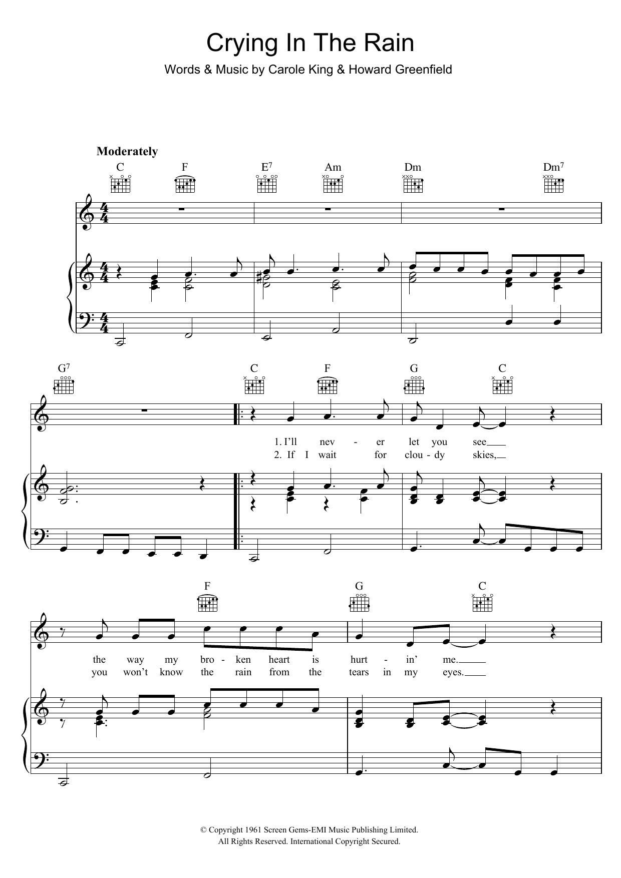 Download or print The Everly Brothers Crying In The Rain sheet music, chords and digital score arranged for Piano, Vocal & Guitar Chords. This Pop score includes 3 page(s).