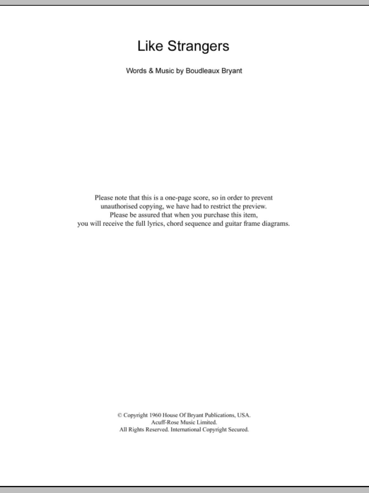 Download or print The Everly Brothers Like Strangers sheet music, chords and digital score arranged for Guitar Chords/Lyrics. This Pop score includes 2 page(s).