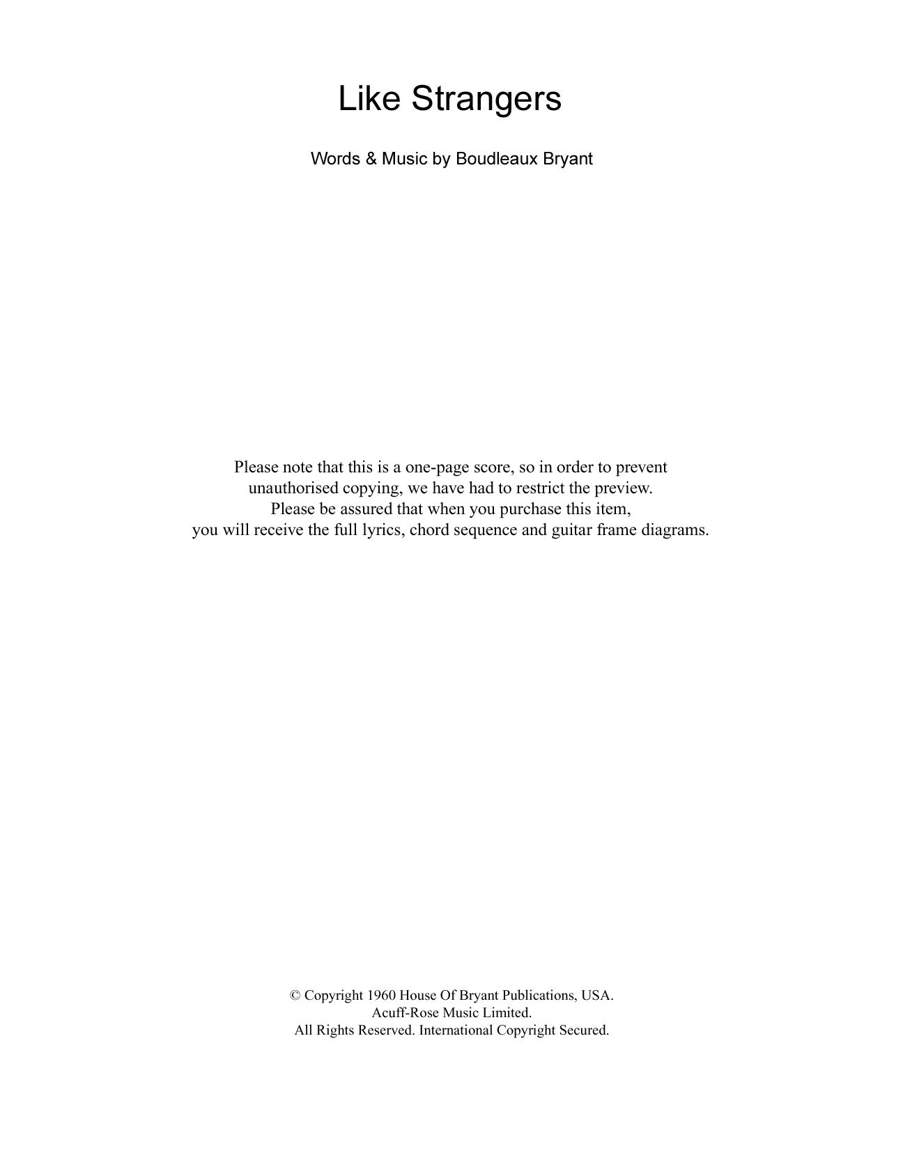 Download or print The Everly Brothers Like Strangers sheet music, chords and digital score arranged for Guitar Chords/Lyrics. This Pop score includes 2 page(s).