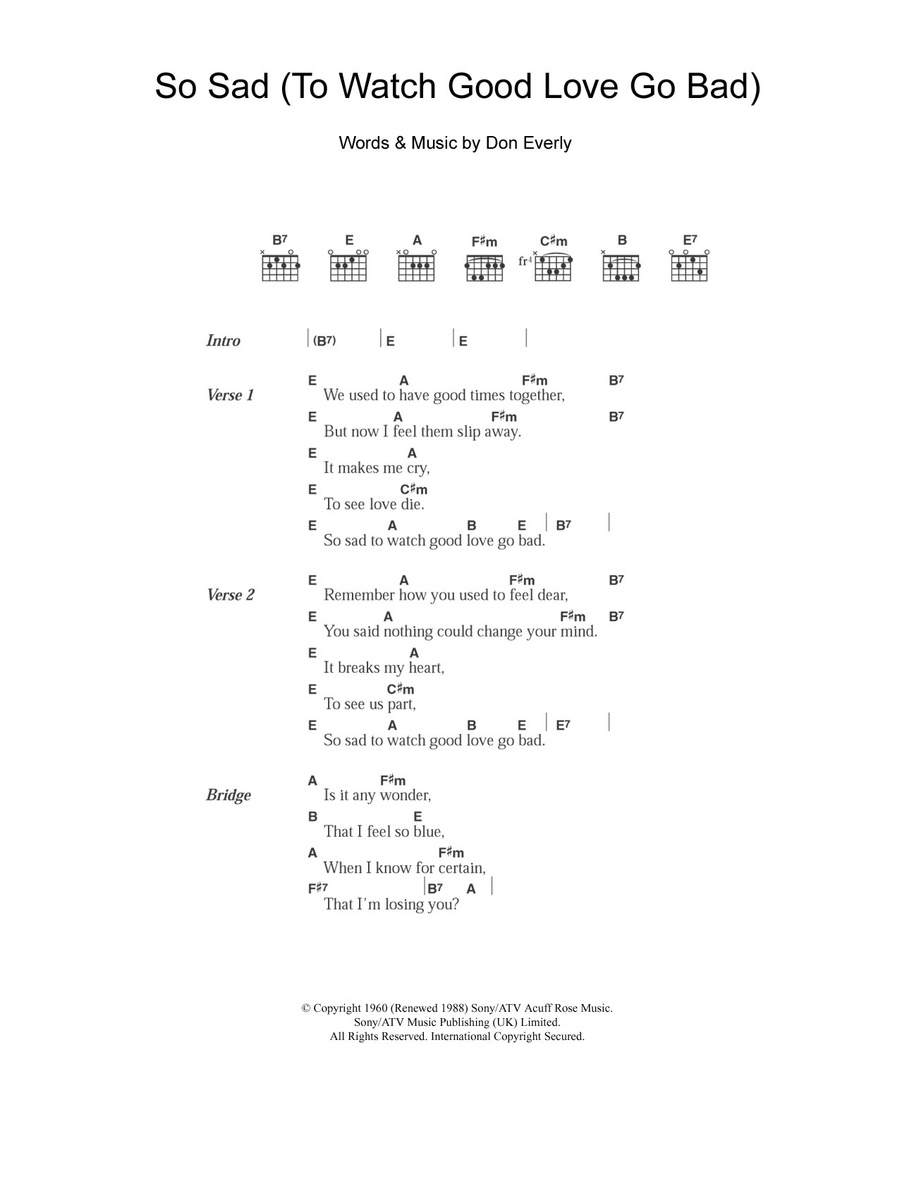 Download or print The Everly Brothers So Sad (To Watch Good Love Go Bad) sheet music, chords and digital score arranged for Guitar Chords/Lyrics. This Country score includes 2 page(s).