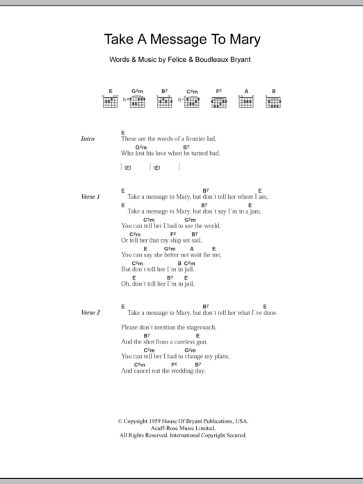 Download or print The Everly Brothers Take A Message To Mary sheet music, chords and digital score arranged for Guitar Chords/Lyrics. This Pop score includes 2 page(s).