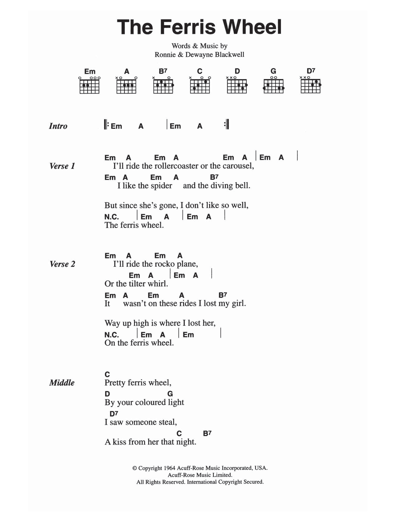 Download or print The Everly Brothers The Ferris Wheel sheet music, chords and digital score arranged for Guitar Chords/Lyrics. This Pop score includes 2 page(s).