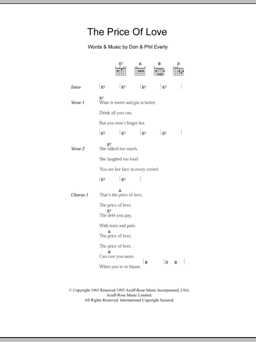 Download or print The Everly Brothers The Price Of Love sheet music, chords and digital score arranged for Guitar Chords/Lyrics. This Pop score includes 2 page(s).
