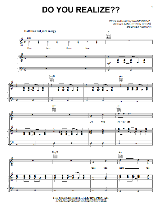 Download or print The Flaming Lips Do You Realize?? sheet music, chords and digital score arranged for Piano, Vocal & Guitar Chords (Right-Hand Melody). This Alternative score includes 8 page(s).