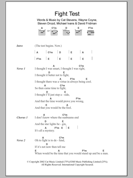 Download or print The Flaming Lips Fight Test sheet music, chords and digital score arranged for Guitar Chords/Lyrics. This Rock score includes 3 page(s).