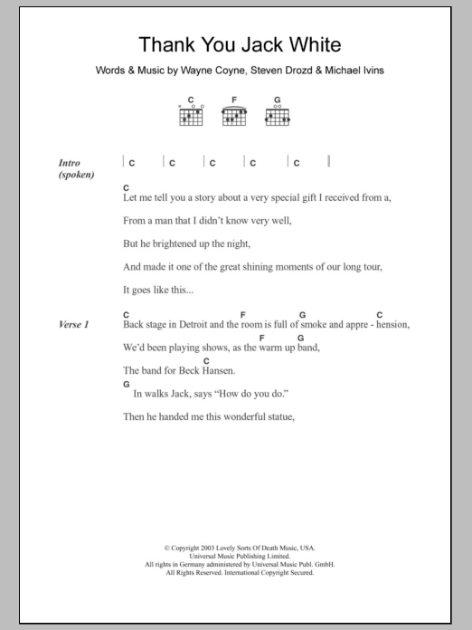 Download or print The Flaming Lips Thank You Jack White sheet music, chords and digital score arranged for Guitar Chords/Lyrics. This Alternative score includes 2 page(s).