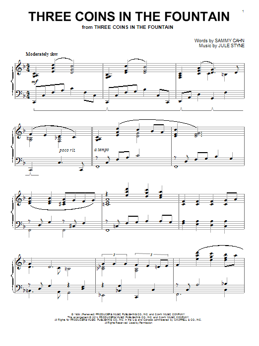 Download or print The Four Aces Three Coins In The Fountain sheet music, chords and digital score arranged for Piano Solo. This Pop score includes 4 page(s).