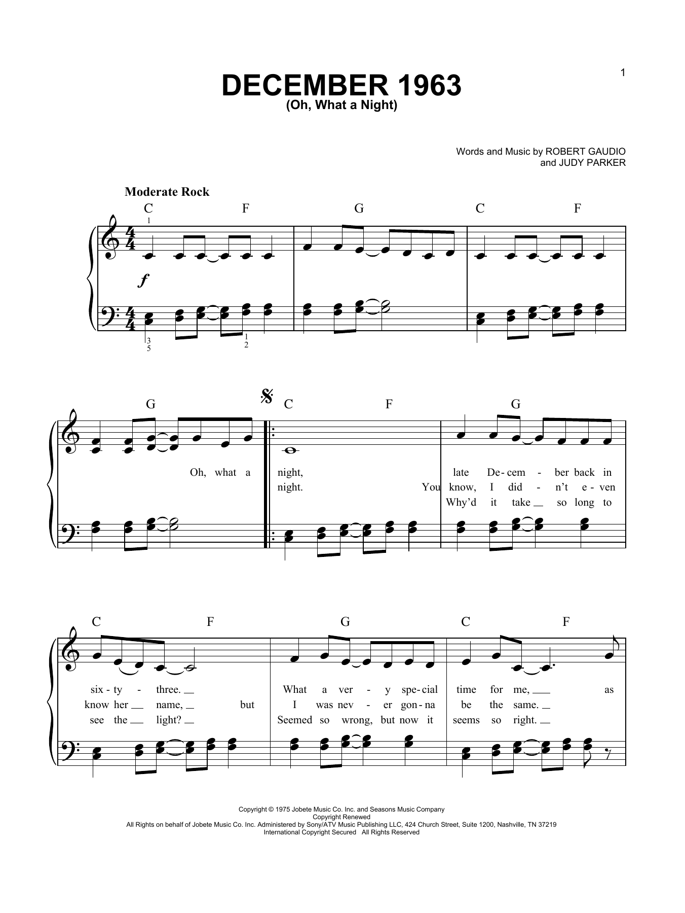 Download or print The Four Seasons December 1963 (Oh, What A Night) sheet music, chords and digital score arranged for Guitar Chords/Lyrics. This Pop score includes 3 page(s).