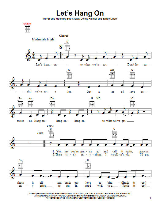 Download or print The Four Seasons Let's Hang On sheet music, chords and digital score arranged for Guitar Chords/Lyrics. This Pop score includes 2 page(s).