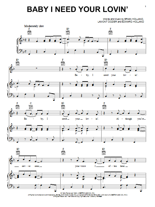 Download or print The Four Tops Baby I Need Your Lovin' sheet music, chords and digital score arranged for Piano, Vocal & Guitar Chords (Right-Hand Melody). This Love score includes 6 page(s).