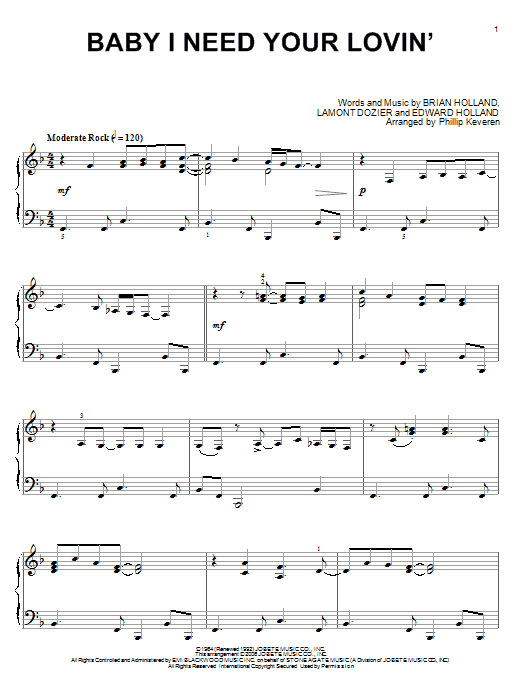 Download or print The Four Tops Baby I Need Your Lovin' (arr. Phillip Keveren) sheet music, chords and digital score arranged for Piano Solo. This Love score includes 3 page(s).
