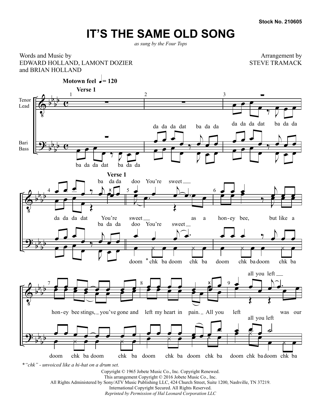 Download or print The Four Tops It's the Same Old Song (arr. Steve Tramack) sheet music, chords and digital score arranged for TTBB Choir. This Barbershop score includes 8 page(s).