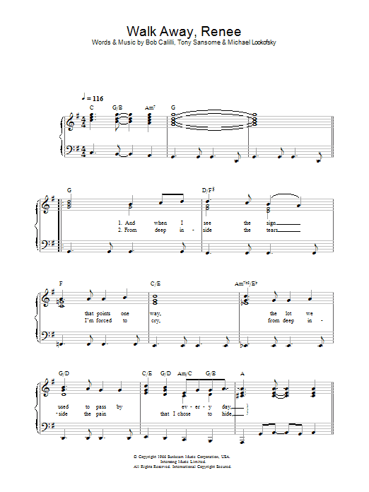 Download or print The Four Tops Walk Away, Renee sheet music, chords and digital score arranged for Piano Chords/Lyrics. This Pop score includes 2 page(s).