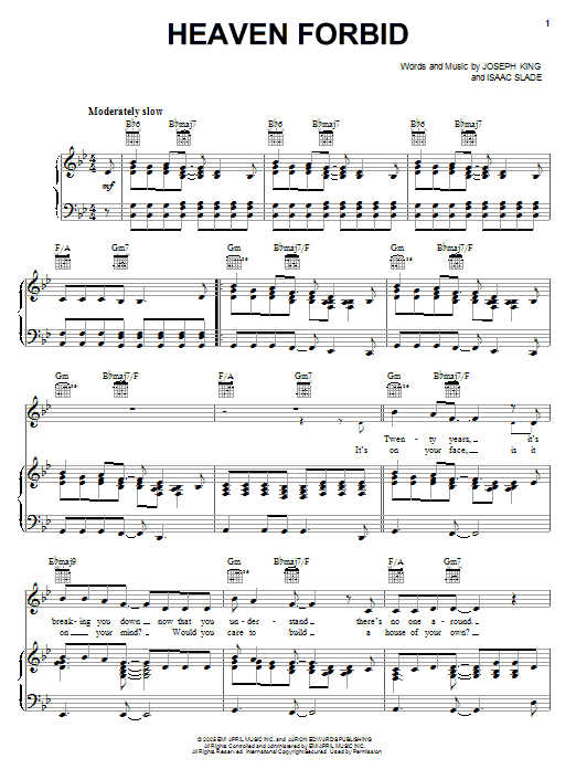 Download or print The Fray Heaven Forbid sheet music, chords and digital score arranged for Easy Piano. This Rock score includes 6 page(s).