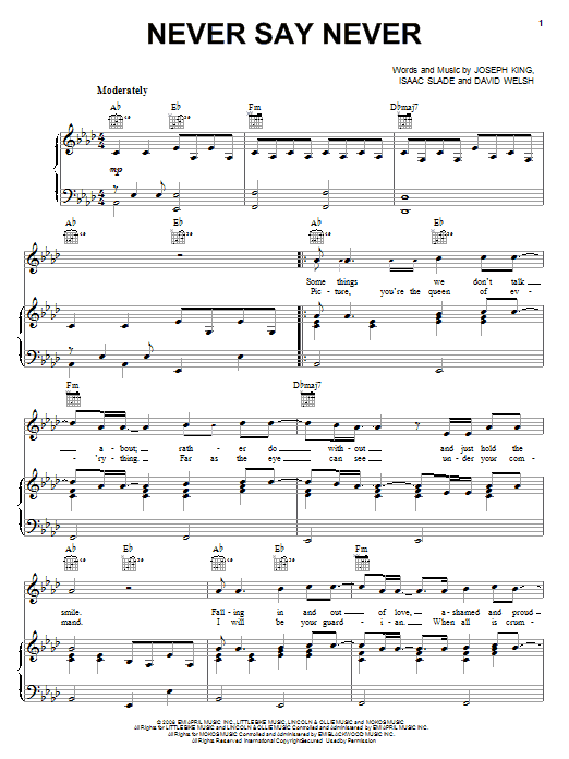 Download or print The Fray Never Say Never sheet music, chords and digital score arranged for Piano, Vocal & Guitar Chords (Right-Hand Melody). This Pop score includes 5 page(s).